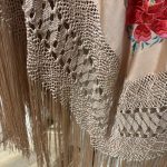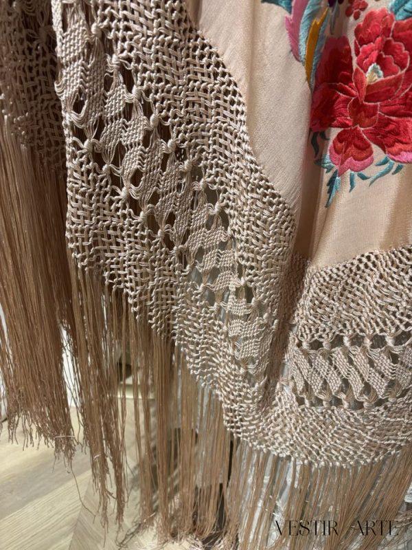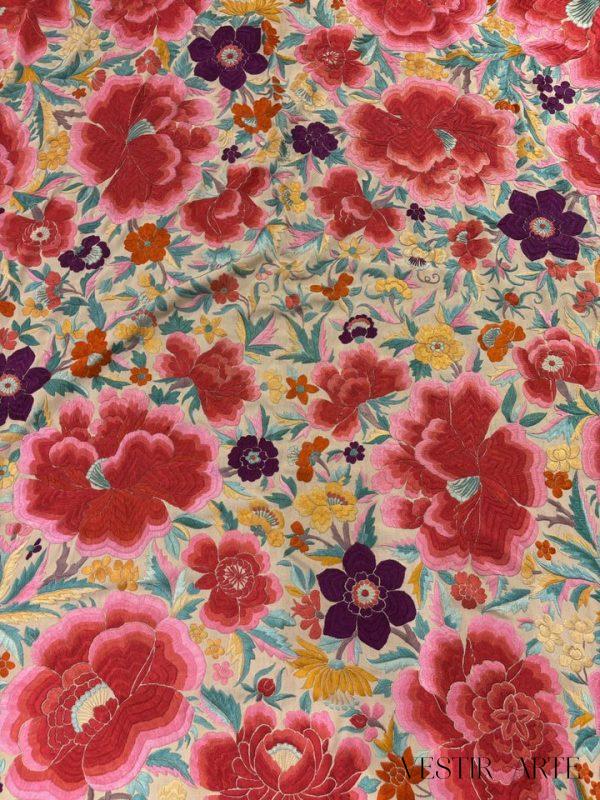 Mantón antiguo en seda natural rosa bordado a mano