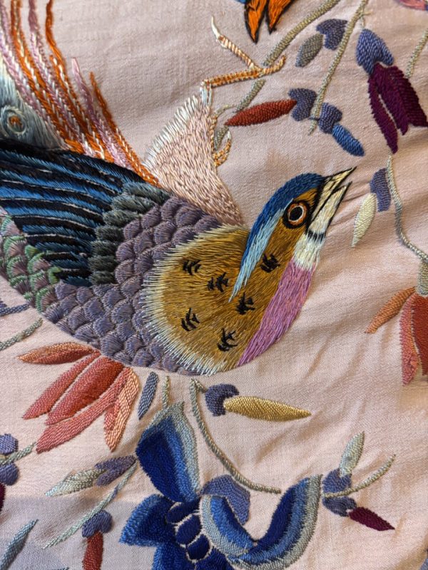 El bordado en seda destaca por una paleta cromática rica pero matizada, característica de los mantones más elegantes: predominan los rojos teja, coral y granate suave, combinados con azules cobalto y turquesa, verdes agua, verde oliva y salvia, así como delicados matices en malva, marfil y beige dorado. La superposición de colores y la gradación tonal aportan profundidad, volumen y una marcada sensación de movimiento, destacando en particular el pelaje de las aves del paraíso , realizado en técnida de pintura a la aguja «aqua pictae»
