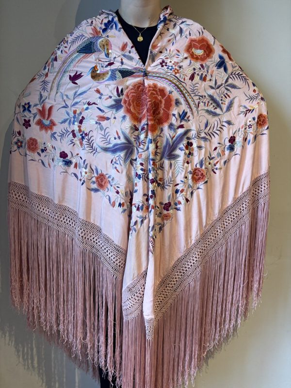 Mantón de Manila antiguo realizado en seda natural de tono rosa empolvado, suave y luminoso que actúa como fondo unificador del complejo programa decorativo. Sobre esta base se desarrolla un bordado compuesto por aves del paraíso exóticas enfrentadas y una profusa ornamentación floral, organizada en cuarterones en una composición simétrica de gran equilibrio visual, que deja en el centro del mantón la cruz característica de los mantones estilo imperio. Por su diseño, y por la fineza de la seda y fleco , es un mantón de gran ligereza , muy fácil de llevar (Pesa entre 1 kilo y kilo y medio).