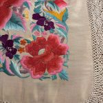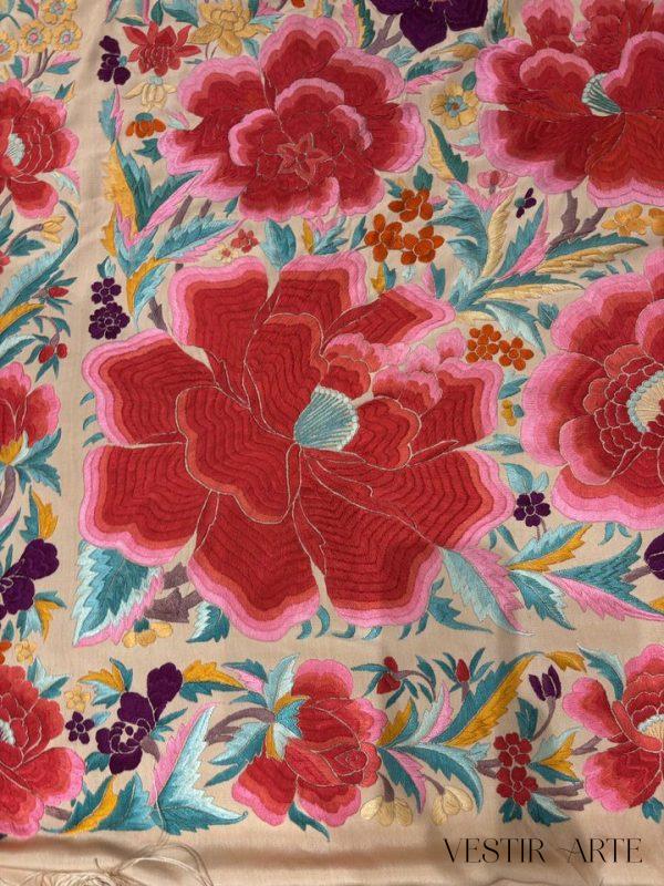 Mantón antiguo en seda natural rosa bordado a mano