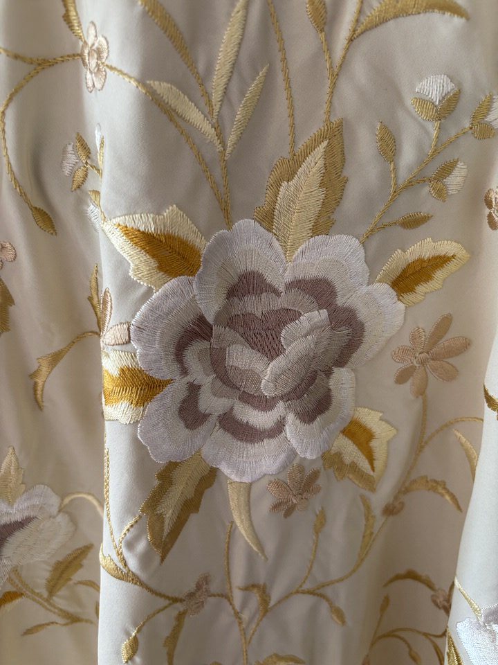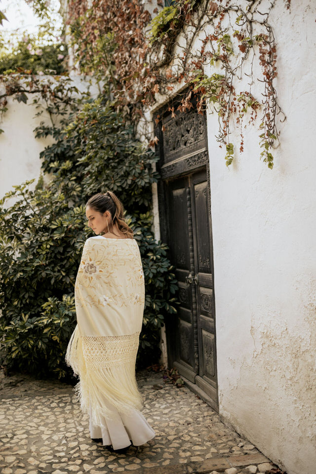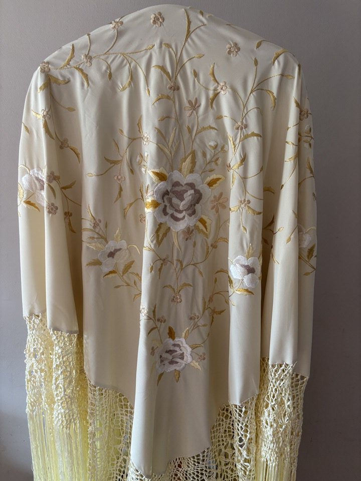 El bordado realizado en España con hilos de tacto seda y colores intensos, resalta sobre el crespón aportando un acabado luminoso y sofisticado. Con un peso medio de 800 g, resulta cómodo de manejar para invitadas, novias, baile flamenco o trajes regionales.