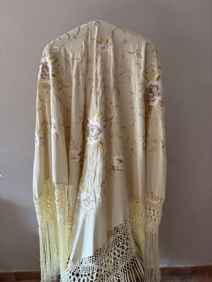 Mantón de Manila de color beige o crema bordado con motivos florales de color blanco, oro viejo y gris . De forma cuadrada o mantón entero, es elegante y atemporal, perfecta como mantón de invitada o de novia. El Mantón de Manila bordado en colores blancos y beige, elaborado en crespón de máxima calidad, con tacto seda tiene hilos de color dorado, que lo hacen perfecto para combinar con complementos dorados de invitada o novia.