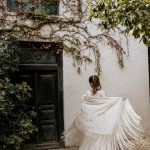 Maravilloso mantón de Manila de seda natural de color blanco roto ( no es blanco óptico es más crudo sin llegar a ser marfil) con motivos del mismo tono, ricamente bordado a máquina. De forma cuadrada de 130×130 cm más flecos, elegante y atemporal, perfecta como mantón de invitada, flamenca o traje regional.