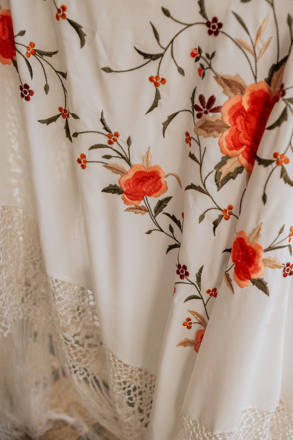 El bordado realizado en España con hilos de tacto seda y colores intensos, resalta sobre el crespón aportando un acabado luminoso y sofisticado. Con un peso medio de 800 g, resulta cómodo de manejar para invitadas, novias, baile flamenco o trajes regionales.