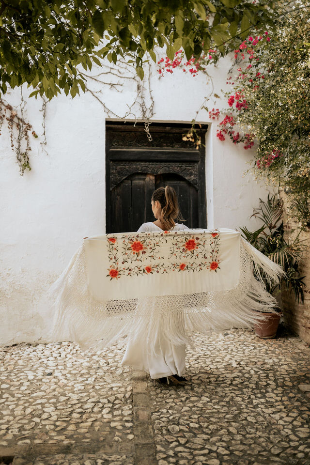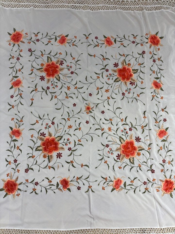 Mantón blanco color blanco roto ( no es blanco óptico es más crudo) con motivos naranjas de crespón. De forma cuadrada de 132×132 cm más flecos, elegante y atemporal, perfecta como mantón de invitada, flamenca o traje regional.