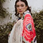 Dale un toque de elegancia y tradición a tu estilo con este mantón de seda blanco, inspirado en un mantón de cigarrera antiguo de colección. Su diseño se basa en un mantón isabelino con rosas grandes y mariposas bordadas, resaltando en tonos buganvilia, rojo, oro y azulón sobre un fondo blanco roto.
