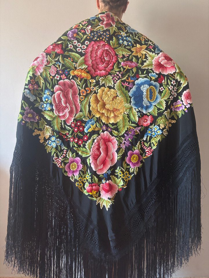Mantón grande negro bordado con rosas