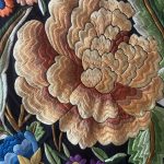 Bordado profusamente a mano con un estallido de flores en colores vivos y contrastados. Es una pieza única de gran riqueza cromática y artesanal, rematada con un macramé en seda negro anudado también a mano, que aporta peso, movimiento y elegancia al conjunto.
