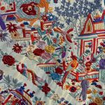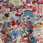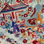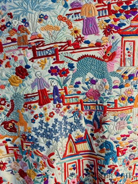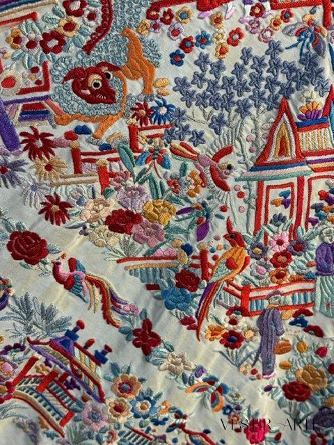 Su bordado en seda multicolor presenta un exquisito paisaje con pagodas, personajes ataviados con vestimenta tradicional en escenas típicas rurales, puentes y animales mitológicos creando una composición única y llena de simbolismo. Los colores vivos —rojos, azul gris, naranjas, lilas y verdes— contrastan bellamente con el fondo claro marfil, aportando profundidad y luminosidad a la pieza.