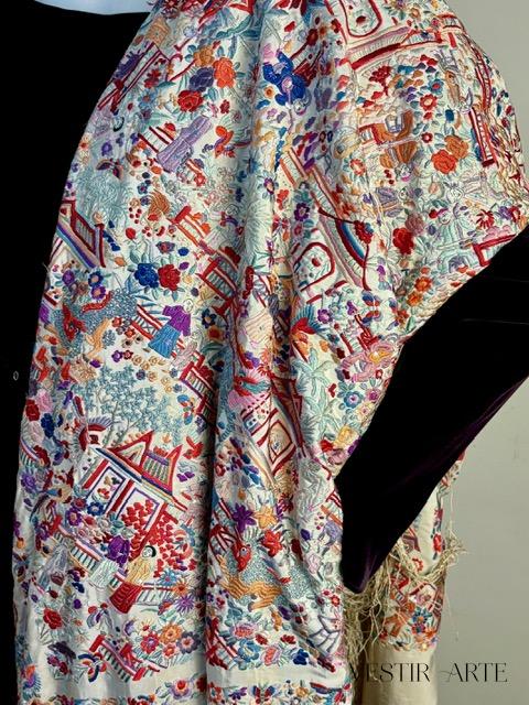 Mantón de Manila antiguo de chinos bordado a mano – Seda natural y motivos costumbristas orientales- pieza exclusiva
