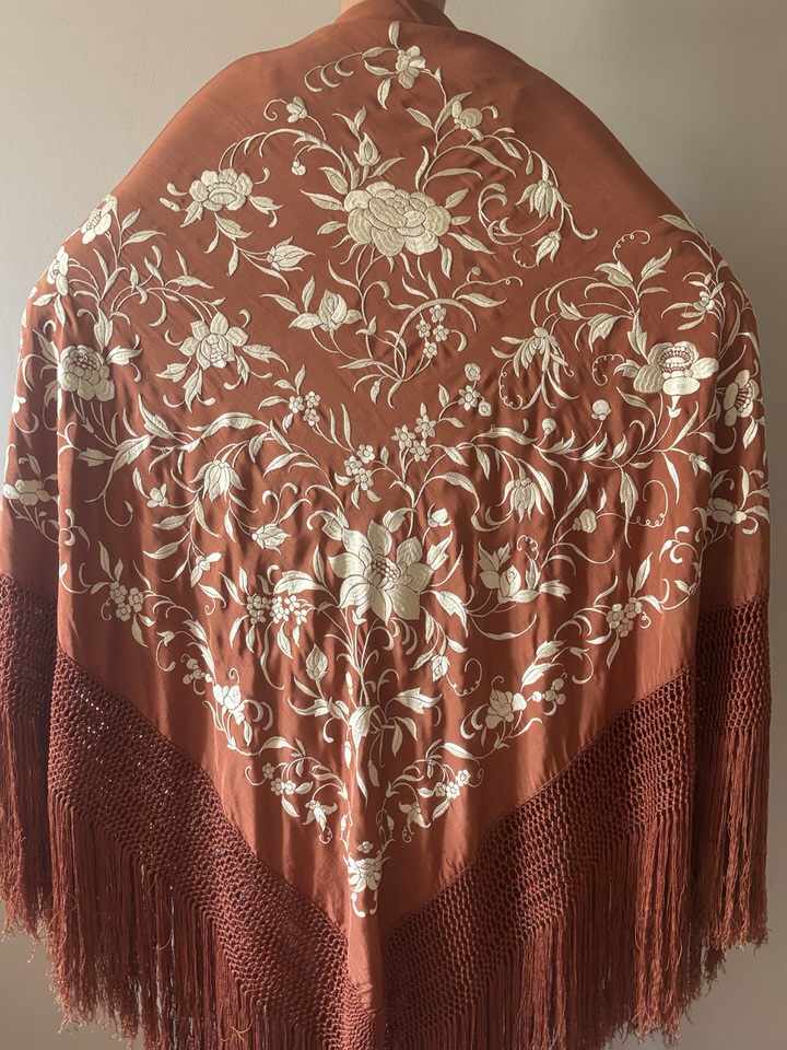 Mantón de Manila antiguo seda natural color marrón tabaco bordado a mano