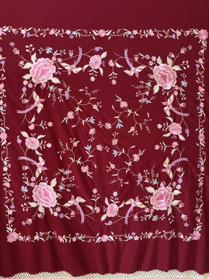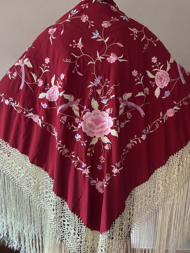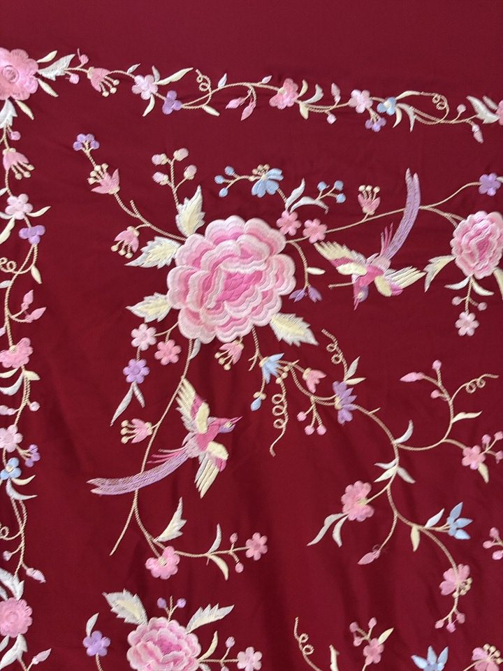 Mantón de color rojo con motivos florales y pájaros en tonos rosa, lila, beige y azul celeste .Es un mantón entero de forma cuadrada de 132×132 cm más flecos, elegante y atemporal, perfecta como mantón de invitada, flamenca o traje regional.
