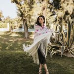 Bordado a máquina en el mismo tono elaborado en seda natural 100% de máxima calidad .Está ricamente bordado con motivos florales ,aves del paraíso y piñas, lo que da una textura maravillosa al mantón. El bordado es idéntico por delante y por detrás. Su diseño cuadrado de 130 x 130 cm, rematado con un enrejado amplio y flecos de 50 cm, lo convierte en un accesorio versátil tanto para colocar tanto en pico como en cuadrado.