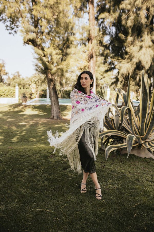 Maravilloso mantón de Manila de seda natural de color blanco roto ( no es blanco óptico es más crudo sin llegar a ser marfil) con motivos del mismo tono, ricamente bordado de colores pasteles: rosas, malvas, azules y ocres. De forma cuadrada de 130×130 cm más flecos, elegante y atemporal, perfecta como mantón de invitada, flamenca o traje regional.