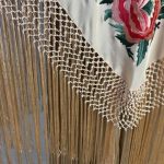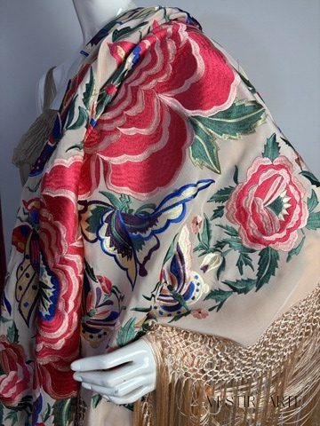 Dale un toque de elegancia y tradición a tu estilo con este mantón de seda bordado, inspirado en un mantón de cigarrera antiguo de colección. Consta de rosas grandes y mariposas bordadas, resaltando en tonos coral, oro y azulón sobre un fondo blanco roto. La combinación coral y salmón es maravillosa y combina con todo.
