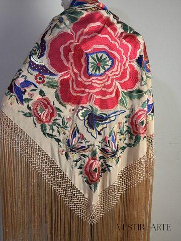 El Mantón de seda rosa melocotón con flor grande y mariposas, inspirado en un mantón cigarrera antiguo de colección.