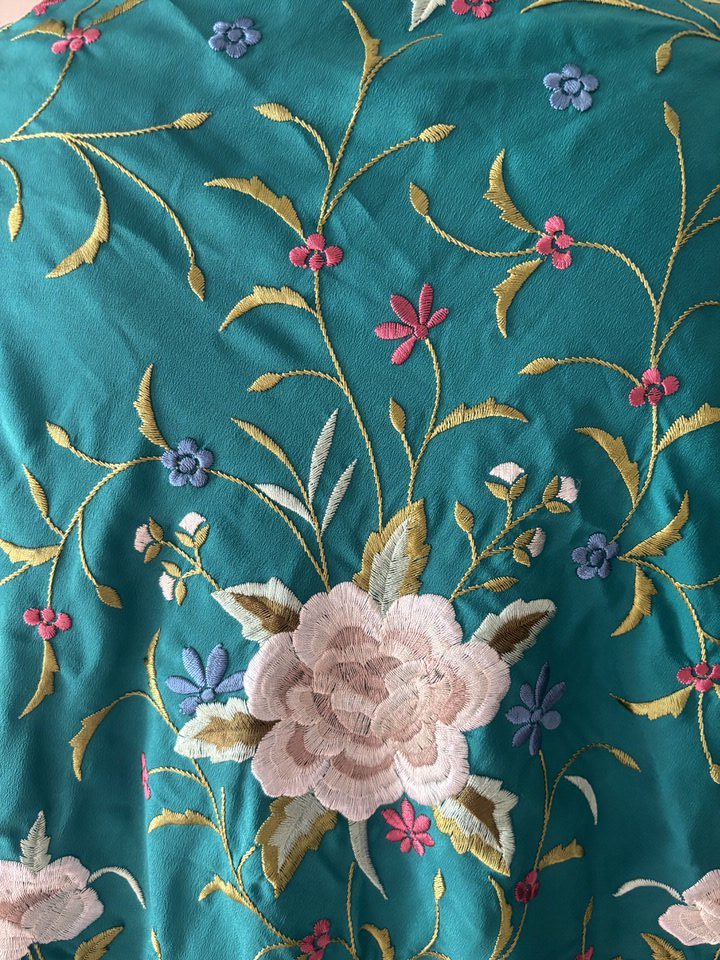 El bordado realizado en España con hilos de tacto seda y colores intensos, resalta sobre el crespón aportando un acabado luminoso y sofisticado. Con un peso medio de 800 g, resulta cómodo de manejar para invitadas, novias, baile flamenco o trajes regionales.