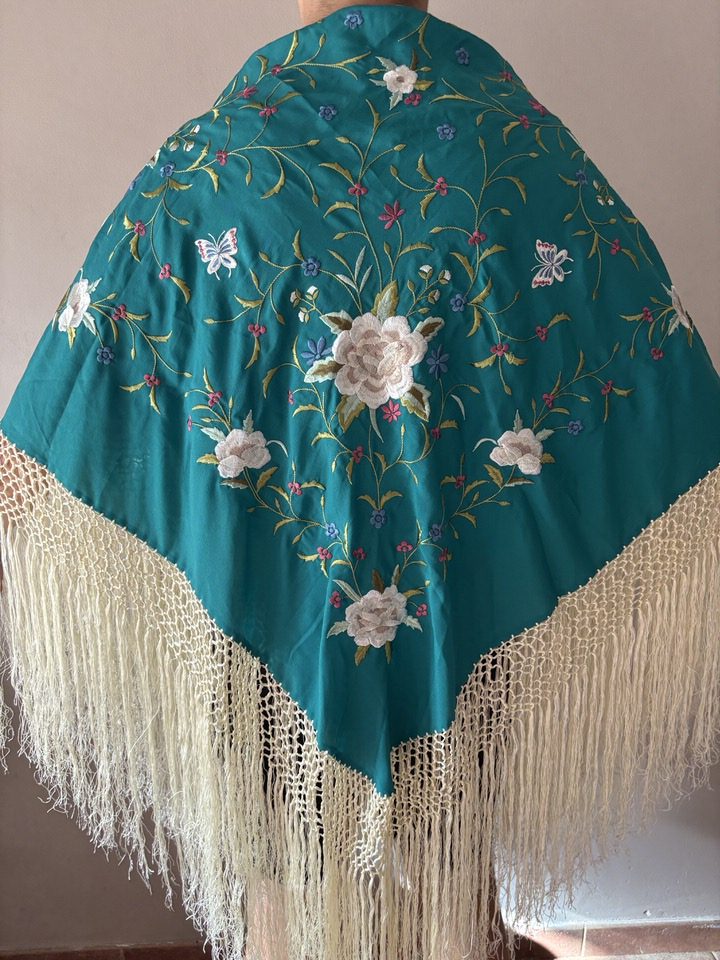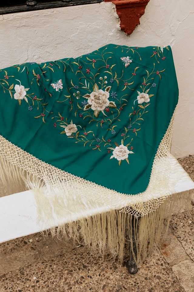 Mantón color verde con motivos florales en tonos beiges, blancos y grises . Es un mantón entero forma cuadrada de 110×110 cm más flecos, elegante y atemporal, perfecto como mantón de invitada, flamenca o traje regional.