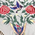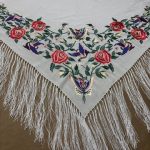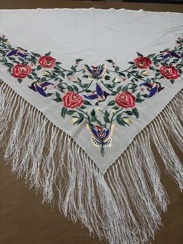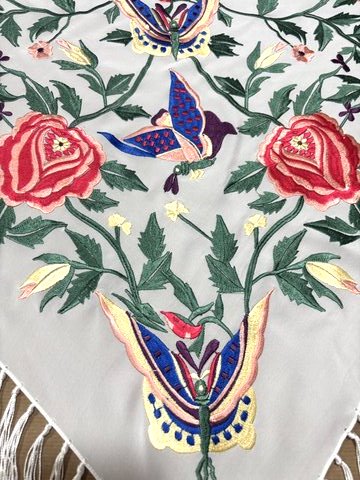 Mantoncillo triangular de seda blanco bordado sobre seda con motivos florales y mariposas . Los flecos y macramé están anudados a mano. Su diseño se basa en un mantón isabelino con rosas y mariposas bordadas, resaltando en tonos coral, rojo, oro y azulón sobre un fondo blanco roto.