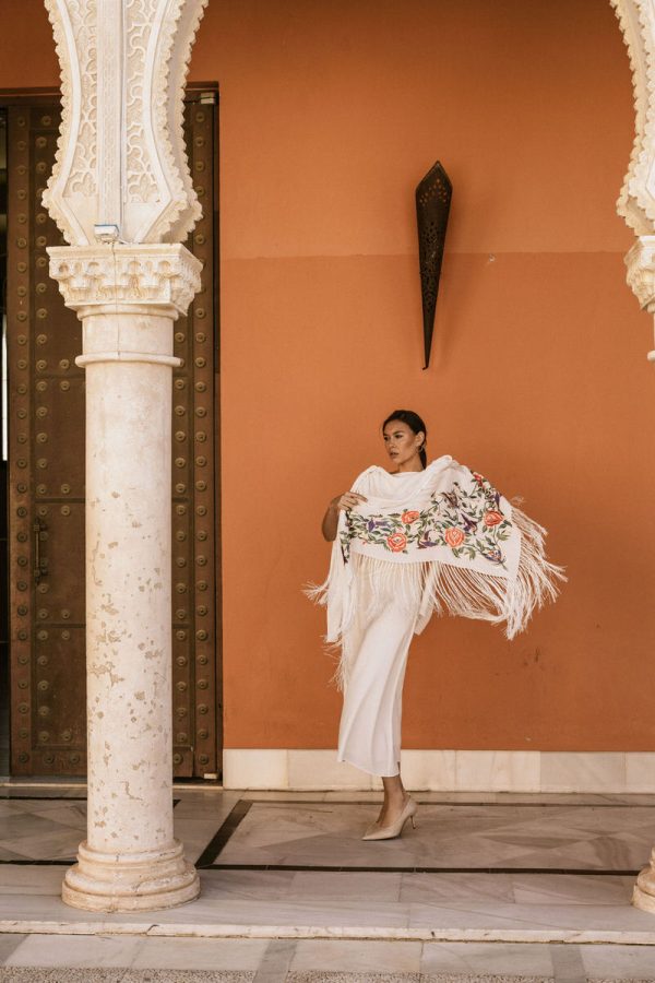 Este mantón de pico triangular es fácil de llevar y perfecto para ocasiones especiales como bodas, eventos flamencos o para realzar cualquier conjunto con un toque sofisticado.