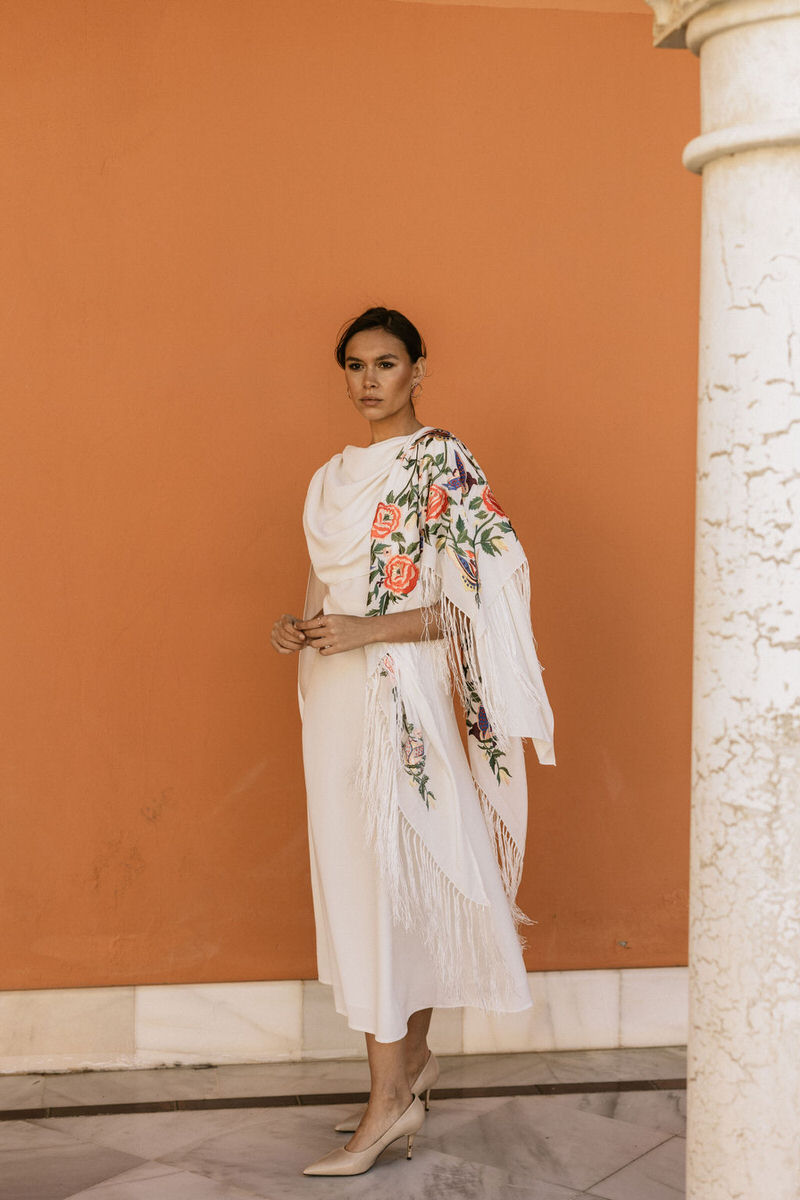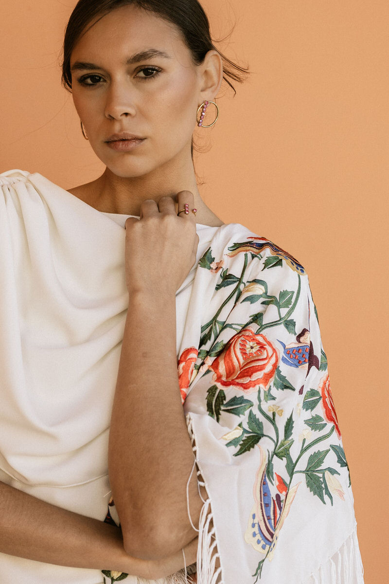 Mantoncillo triangular de seda blanco bordado sobre seda con motivos florales y mariposas . Los flecos y macramé están anudados a mano. Su diseño se basa en un mantón isabelino con rosas y mariposas bordadas, resaltando en tonos coral, rojo, oro y azulón sobre un fondo blanco roto.
